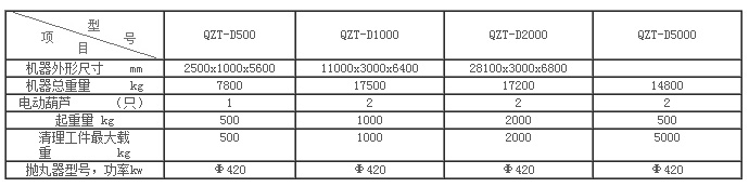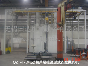 用于扁平超长的工件,可由电动葫芦吊挂。连续通过抛丸清理室。根据产量,可以双面抛,也可以单面抛后转180o再抛一次。