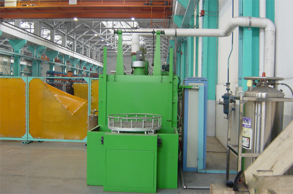 将工件放在转台上或放置在框中,移动进入清洗室,由分布在清洗箱内密集排列的喷嘴喷出射流,以清洗置于旋转工作台上的零部件。